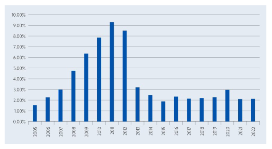 Hinzu kam, dass die westlichen Anleger die Krise rund um die Silicon Valley Bank und die Credit Suisse zum Anlass genommen haben, ihre Allokationen in Währungsmetalle zu überdenken. Sorgen über Gegenparteirisiken und eine Destabilisierung des Finanzsystems haben erneutes Interesse an Gold geweckt. Tatsächlich zeigt die ETF-Statistik des World Gold Council für März den ersten Zufluss in Gold-ETFs seit zehn Monaten 1 . Trotzdem sind die Anleger in der Anlageklasse weiterhin untergewichtet: Gold-ETFs haben immernoch nur einen Anteil von rund 2% an allen börsengehandelten Wertpapieren (siehe unten).