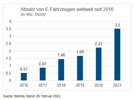 Den größten Anteil des globalen Gesamtbedarfs an Batterien stellt bisher allerdings die Nachfrage nach batteriebetriebenen Elektrofahrzeugen. Trotz steigender Rohstoffkosten dürfte dieser Markt auch 2022 weiter wachsen, da der globale Chipmangel geringer wird und die BEV-Durchdringung weiter zunimmt.