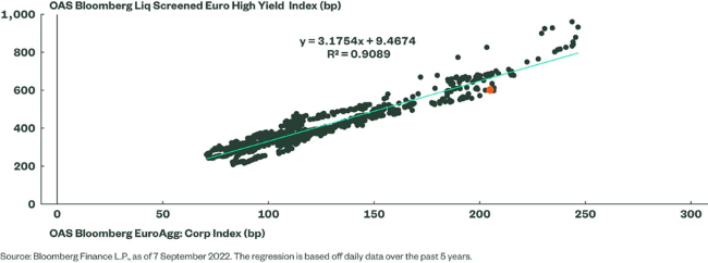 - Größere Spreads preisen bereits eine wirtschaftliche Verlangsamung ein. Der Spread des Bloomberg Euro Corporate 0-3 Year Index gegenüber Staatsanleihen liegt wieder in dem Bereich, der zuletzt zwischen 2008 und 2012 zu beobachten war. Es ist auch offensichtlich, dass Investment-Grade-Anleihen eine deutlichere Neubewertung erfahren haben als Non-Investment-Grade. Abbildung 1 zeigt, dass die optionsbereinigten Spreads des Bloomberg Euro Aggregate: Corporates Index im Vergleich zum Bloomberg Liquidity Screened Euro High Yield Index auf der Grundlage einer fünfjährigen Historie weit sind. Die stärkere Neubewertung von Investitionskrediten dürfte zum Teil darauf zurückzuführen sein, dass die EZB ihre Käufe von Investment-Grade-Papieren eingestellt hat. Dennoch sind Hochzinsanleihen nach wie vor weitaus anfälliger für eine Rezession im Euroraum als Investment-Grade-Unternehmenspapiere.