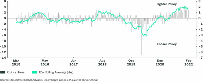 Die Fed und andere DM-Zentralbanken stehen aktuell unter Druck, weil der Markt denkt, dass sie im Trend zurückliegen. Die Inflation erwies sich nicht (wie erwartet) als vorübergehend, sondern stieg stärker als erwartet an, und viele Zentralbanken haben trotz angespannter Arbeitsmärkte ihre extrem restriktiven politischen Einstellungen beibehalten. Die Zentralbanken der Schwellenländer haben jedoch auf die Inflation reagiert und die Zinssätze trotz der in vielen Fällen recht schwerwiegenden wirtschaftlichen Auswirkungen der Pandemie von ihren Tiefstständen angehoben. Abbildung 1, ein Diffusionsindex der Zinsänderungen der Zentralbanken, deutet darauf hin, dass der Höhepunkt des Zinsstraffungsdrucks Mitte Dezember 2021 erreicht wurde und nun langsam nachlässt.