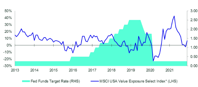 Source: Bloomberg Finance L.P., as of 31 December 2021. Index performance based on monthly net total return in USD. *The MSCI USA Value Exposure Select Index was incepted on 18 February 2015. Results prior to this date were calculated by using available data at the time in accordance with the current index methodology. Past performance is no guarantee of future results. It is not possible to invest directly into an index. Index returns are unmanaged and do not reflect the deduction of any fees or expenses. Index returns reflect all items of income, gain and loss and the reinvestment of dividends and other income as applicable.