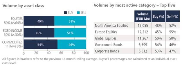In contrast to their equity and fixed income counterparts, commodity ETFs saw net buying for another month. Activity in the asset class increased to 11% of the overall platform flow, beating the previous 12-month rolling average by five percentage points. More than EUR 15 billion was executed in North America Equities products during the month, with buys lagging sells by four percentage points.