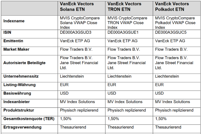 Der Asset Manager VanEck listet drei neue Krypto–ETNs an der Deutschen Börse Xetra.