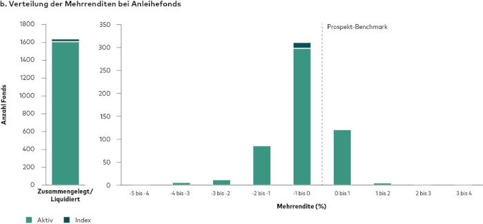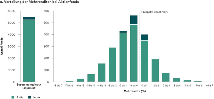 Hinweise: Die Diagramme a. und b. zeigen die Verteilung der Mehrrenditen von Aktien- und Anleihefonds und -ETFs im Vergleich zu ihrer Prospekt-Benchmark für einen Zeitraum von 15 Jahren bis zum 31. Dezember 2022. Die Renditen lauten auf Euro abzüglich Kosten, vor Steuern, bei Wiederanlage der Erträge. Die in dem Diagramm abgebildeten Fonds waren in folgenden Ländern zum Vertrieb zugelassen: Belgien, Dänemark, Deutschland, Finnland, Frankreich, Irland, Italien, Luxemburg, Niederlande, Norwegen, Österreich, Portugal, Schweden, Spanien.