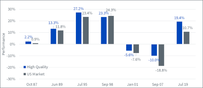 Da sich der Zinserhöhungszyklus dem Ende zuneigt, ist es interessant, einen Blick auf die bisherige Entwicklung der Aktienmärkte in den zwölf Monaten nach dem Ende von Zinserhöhungszyklen zu werfen. Abbildung 1 zeigt, dass die absolute Wertentwicklung von US-Aktien nach dem Ende der letzten sieben Zinserhöhungszyklen der Fed recht uneinheitlich war. Im besten Zeitraum erzielten US-Aktien eine Rendite von 24 %, im schlechtesten Zeitraum -18,8 %. Betrachtet man allerdings Unternehmen mit hoher Qualität, ist eine gewisse Beständigkeit festzustellen, da diese Titel den Markt in sechs der sieben Zeiträume übertrafen. Der einzige Zeitraum, der abweicht, war das Jahr 1998, als Qualitätsunternehmen „nur“ 23,3 % gegenüber einer Marktrendite von 24,3 % erzielten. In den beiden Perioden, in denen Aktien negative Renditen verzeichneten, federten Qualitätsunternehmen die Verluste gut ab und verringerten den Drawdown erheblich.