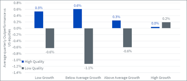 Zunächst ist die Widerstandsfähigkeit von Qualitätsunternehmen zu beobachten. Unternehmen mit geringer Qualität schneiden nur dann besser ab, wenn die Wirtschaft auf Hochtouren läuft, Unternehmen mit hoher Qualität dagegen in allen vier Umfeldern. Aktien von hoher Qualität erzielen eine bessere Performance, wenn das Wachstum entweder gering oder unterdurchschnittlich ist.