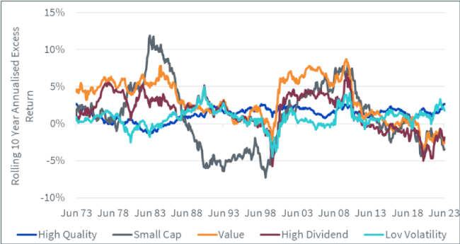 Abbildung 3: Rollierende annualisierte Zehn-Jahres-Überschussrendite von US-Faktoren gegenüber dem Markt