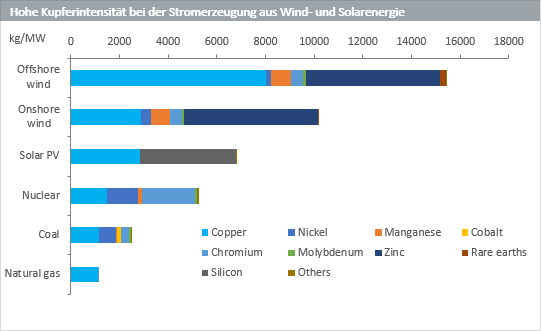 Wind- und Solarenergie gehören heute zu den am weitesten verbreiteten Formen der erneuerbaren Energien. Die nachstehende Abbildung zeigt, wie viel mehr Kupfer bei der Stromerzeugung aus Offshore-Wind (Windturbinen im Meer), Onshore-Wind (Windturbinen an Land) und Solar-Fotovoltaik (PV) im Vergleich zur Erzeugung aus fossilen Brennstoffen wie Kohle und Erdgas benötigt wird.