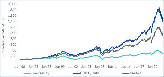 Abbildung 1 veranschaulicht, dass das High-Quality-Portfolio, das die 30 % Aktien mit der höchsten operativen Rentabilität im Universum der Global Developed Equities umfasst, seit 1990 um mehr als 4,5 % pro Jahr besser abschneidet als das Low-Quality-Portfolio (das die 30 % Aktien mit der niedrigsten operativen Rentabilität beinhaltet). Das High-Quality-Portfolio übertrifft außerdem den Markt um 1,4 % pro Jahr und weist eine geringere Volatilität auf, was seine Eignung als anerkannten Aktienfaktor unter Beweis stellt. In der Vergangenheit wiesen Qualitätsaktien langfristig höhere Renditen und eine geringere Volatilität auf, wodurch sich ein sehr attraktives Risiko-Ertrags-Profil für Kernbestände in den Portfolios der Anleger ergibt.