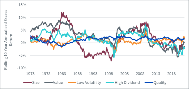 Abbildung 2: Rollierende annualisierte 10-Jahres-Performance von US-Faktoren gegenüber US-Aktien als Ganzes