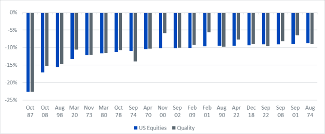 Qualität ist natürlich nicht der einzige defensive Faktor. Sie ist sogar nicht der Faktor mit den höchsten defensiven Eigenschaften – das ist ein Titel, den minimale Volatilität ohne Weiteres für sich beansprucht. Dennoch handelt es sich um einen defensiven Faktor, der immer wieder demonstriert hat, dass er Anlegerportfolios schützen kann, wenn die Aktienmärkte abstürzen. Betrachtet man die letzten 60 Jahre, so zeigt sich, dass in 12 der 15 schlechtesten Monate für US-Aktien der Faktor Qualität den Rückgang abgefedert und die Verluste verringert hat. Im April 2022 zum Beispiel verloren US-Aktien -9,45 %, während der Faktor Qualität nur -7,73 % einbüßte – also ein relatives Plus von 1,72 % verzeichnete. Im März 2020 mussten US-Aktien einen Abschwung von -13,26 % hinnehmen, während der Faktor Qualität lediglich um -10,62 % nachgab, was einer Outperformance von 2,64 % entspricht.
