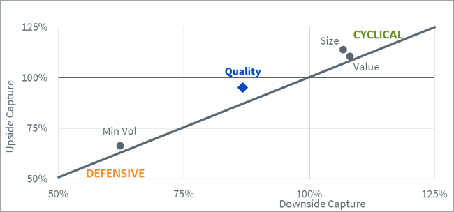 Qualität ist die Strategie, die am weitesten oberhalb der Linie liegt. Sie profitiert daher von einem sehr asymmetrischen Profil mit einer Aufwärtskomponente von 95 % und einer Abwärtskomponente von nur 87 %. Mit anderen Worten: Sie ist ein Faktor, der sowohl Wachstum als auch Defensive bieten kann.