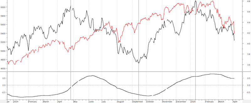 Während dieser vier Phasen wies der S&P 500 bis zu seinem jüngsten Höchststand am 19. Februar (roter Pfeil) ein nahezu konstantes Wachstum auf. Die Korrelationskurve unten bestätigt das Fehlen eines konsistenten Zusammenhangs zwischen beiden Märkten, was auch durch die Diagramme ersichtlich ist. Zwar sollte die „natürliche“ Korrelation umgekehrt sein, doch seit dem Renditetiefpunkt im September 2024 zeigt sich eine direkte Korrelation : Die T-Note-Rendite und der S&P-500-Wert fallen beide.