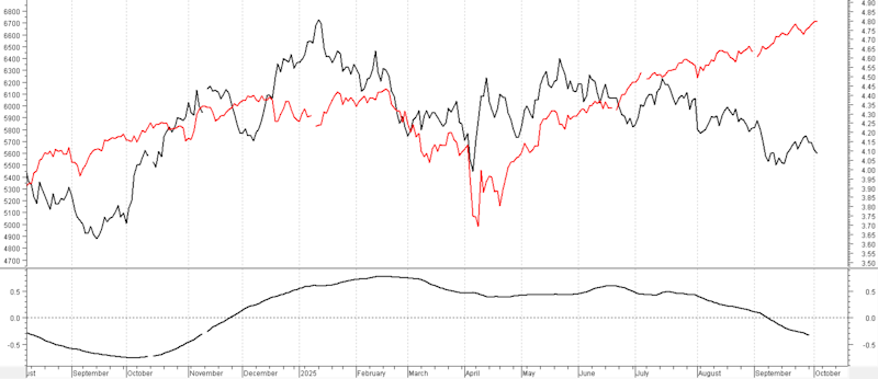 Die schwarze Linie stellt die Rendite der T-Note (rechte Skala) dar, die rote Linie den Wert des S&P500-Index (linke Skala). Unten ist die Korrelation zwischen den beiden Charts dargestellt, berechnet auf der Grundlage von 126 Datenpunkten (d. h. 6 Monaten Daten).