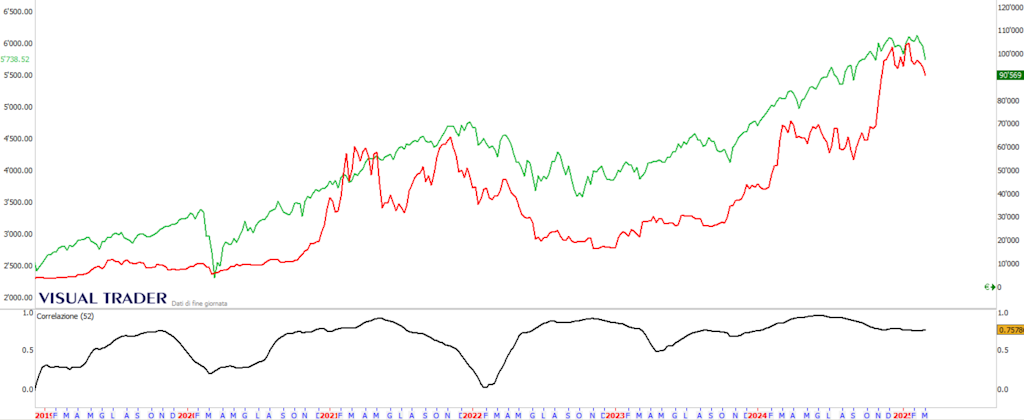 In Rot der Bitcoin; in Grün der S&P500-Index mit wöchentlichen Daten ab Ende 2018. Nur mit wöchentlichen Daten lassen sich valide Vergleiche anstellen, da bei täglichen Daten das Problem von Samstag und Sonntag besteht, an denen Bitcoin gehandelt wird, während regulierte Märkte geschlossen sind.