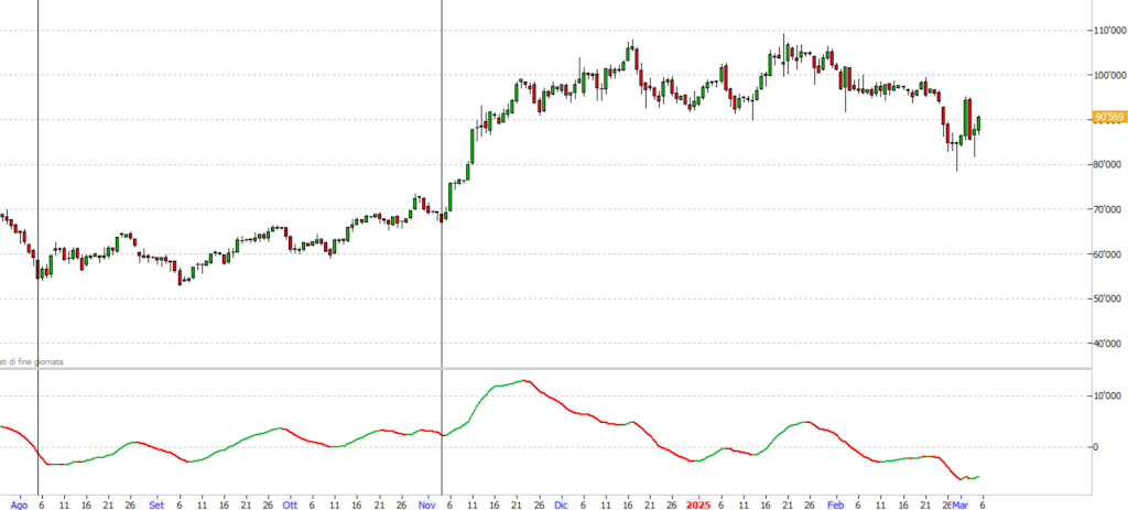 Ab dem 4. November 2024 (mittlere vertikale Linie) folgte ein deutlicher Aufwärtsimpuls mit einem Anstieg von 67.000 auf bis zum Hoch am 17. November. Anschließend herrschte Seitwärtsbewegung, wobei die Preise stets über einem Schlüsselunterstützungsniveau blieben. Ab dem 25. Februar brach der Preis unter diese Unterstützung und markierte am 28. Februar ein Tief unter 80.000 $ (blaue Pfeilspitze). Der zyklische Indikator zeigt dabei eine stetige Abwärtsbewegung.